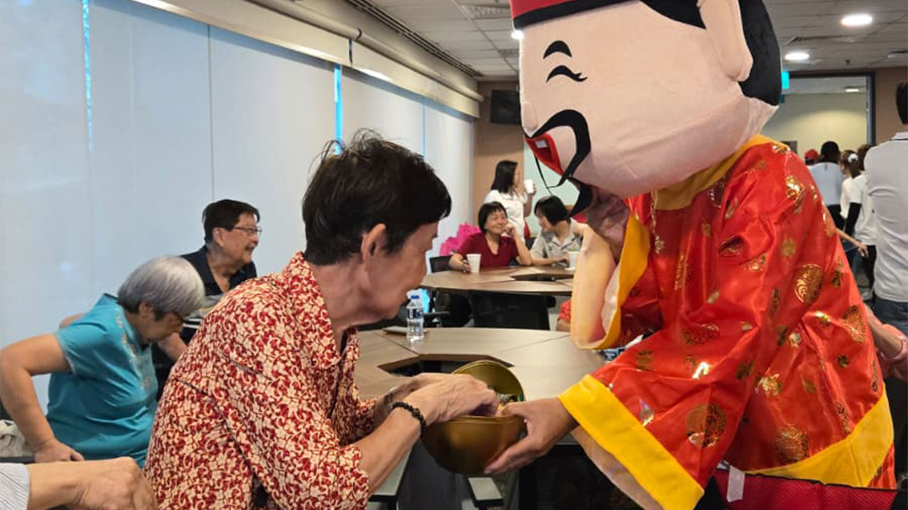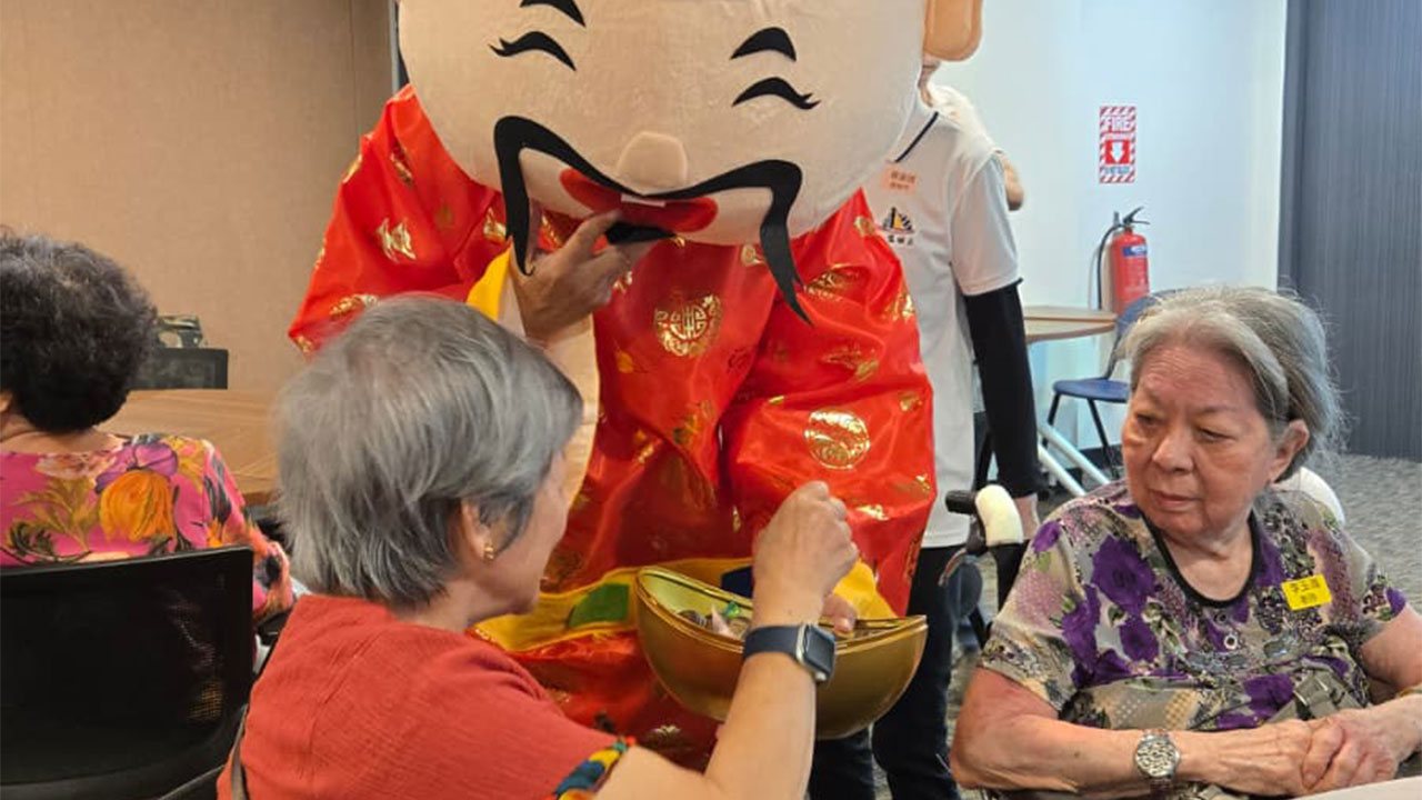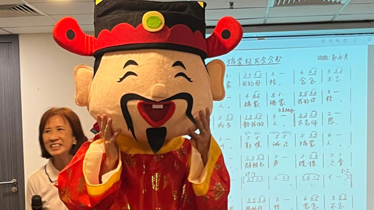 参观完毕进入团拜场所,团拜会由副秘书蔡美娥主持,合唱团引领大家唱校歌开场。副会长陈在伟扮的财神爷派糖菓,摇头晃脑的更逗乐了在场的老师们。这时候大家也都饿了,早准备好的自助餐让大家大快朵颐,行动不便的老师也安排了理事服务送餐食。